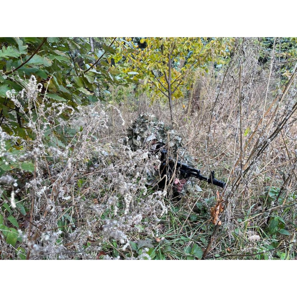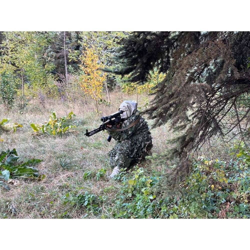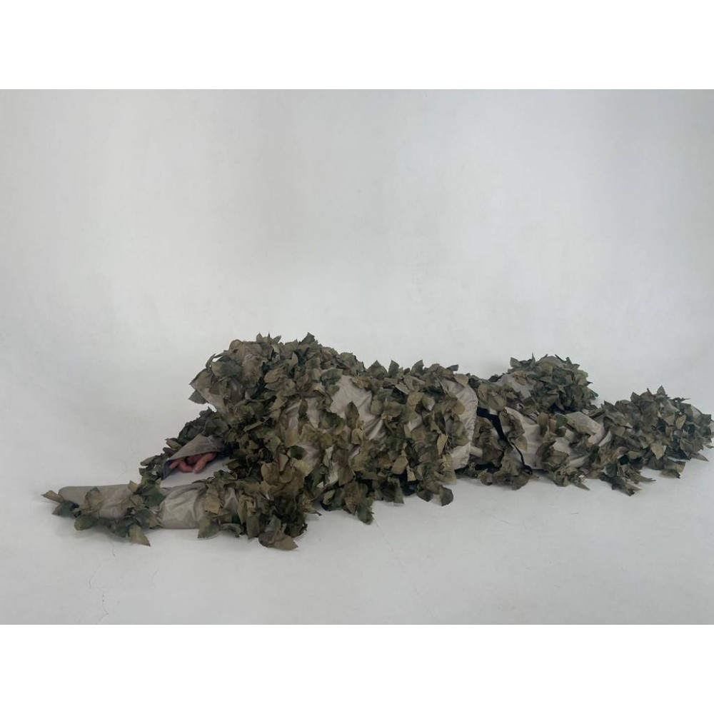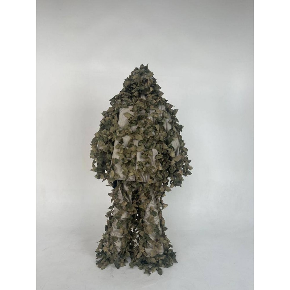 Маска/балаклава: Маска или балаклава изготовлены из того же материала с имитацией листвы, обеспечивая полное покрытие лица и шеи, максимально сокращая тепловую сигнатуру.